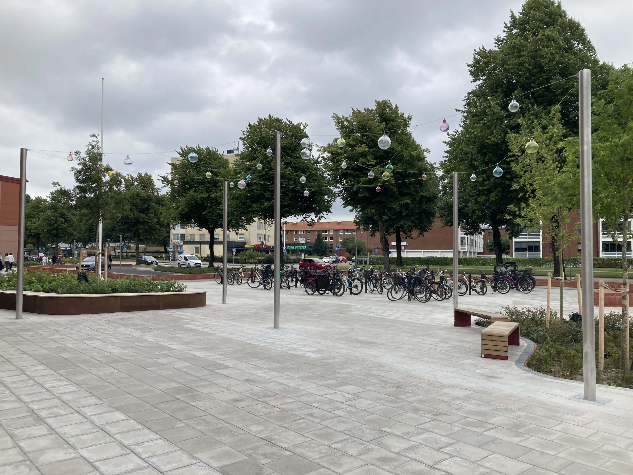 MATERIAL: Gestaltningen består av 29 stycken handblåsta glaskulor som hänger i ett spindelnätsliknande vajersystem mellan fem stående stolpar i rostfritt blästrat stål.
